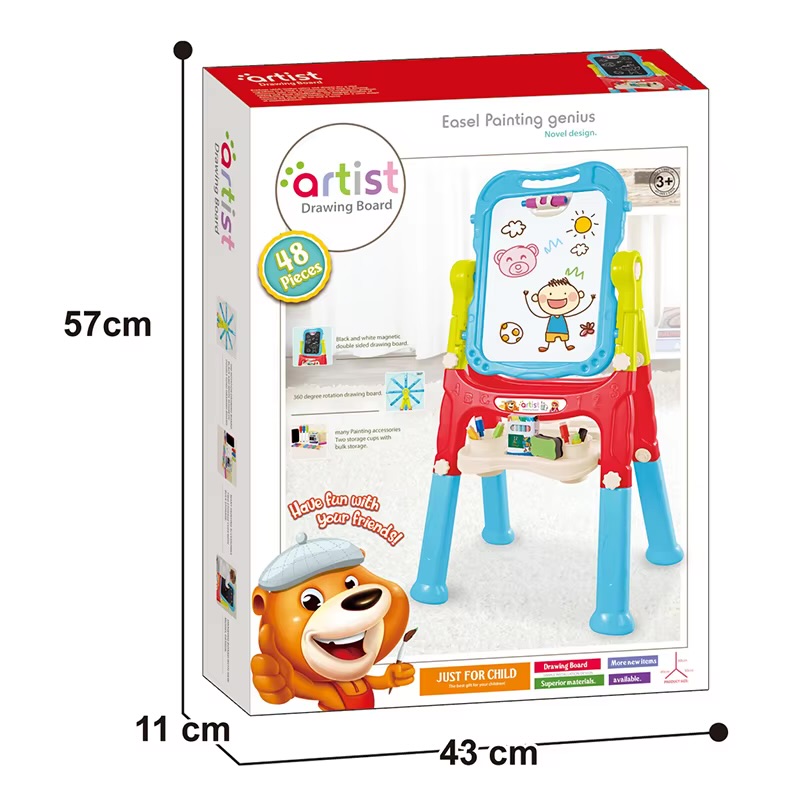 Tabla are doua suprafete pentru desen – alba, conceputa pentru a folosi markere de sters, si neagra, pe care poti desena cu creta. Are capacitatea de a se roti la 360 de grade. Setul include markere in negru, albastru, rosu, verde si galben, precum si un set de 12 bucati de creta. Pentru ca tabla este o jucarie magnetica, setul include magneti colorati cu care poti atasa cartonase cu desenele tale pe tabla. Intregul set contine 48 de elemente.